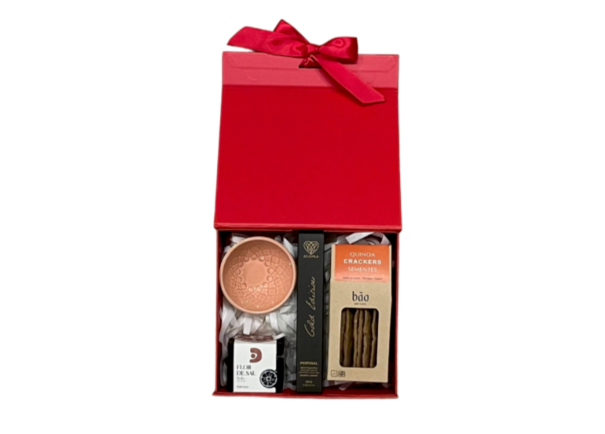 Inside, you’ll find a handmade ceramic plate, Portuguese extra virgin olive oil, quinoa seed crackers, and flor de sal with truffle.